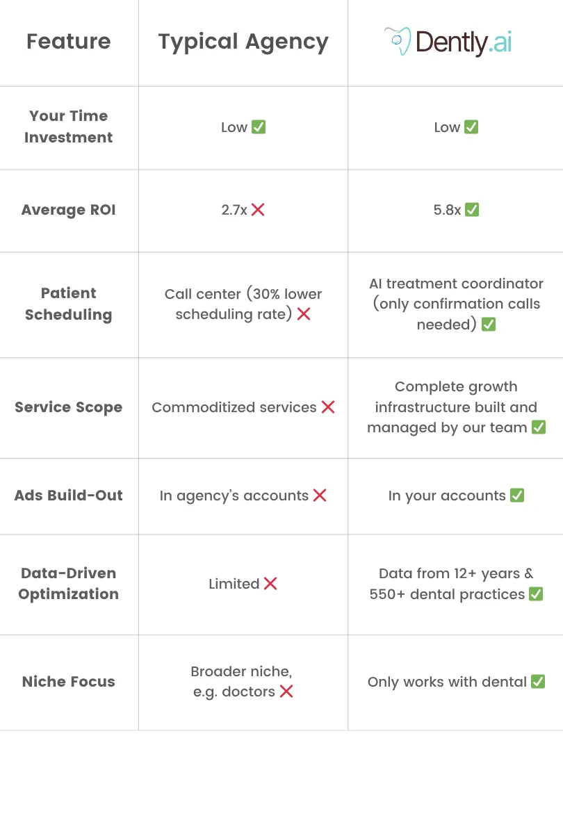 This site is not a part of the Facebook website or Meta Platforms, Inc. Additionally, this site is NOT endorsed by Facebook in any way. FACEBOOK is a trademark of Meta Platforms, Inc. | By submitting your information, you agree to Dently.AI’s Privacy Policy and understand that we will use your information for the primary purpose of communicating with you and marketing our services. | Dently.AI provides managed marketing and automation services for dental practices and does not sell or license standalone software. | Guarantee and performance claims are subject to Terms and Conditions. | Market Sprinter AB | Studievagen 22, 70217 Orebro, SE | +1 415-329-3862 | Correspondence Address: 1875 Mission St 103, San Francisco, CA 94103
